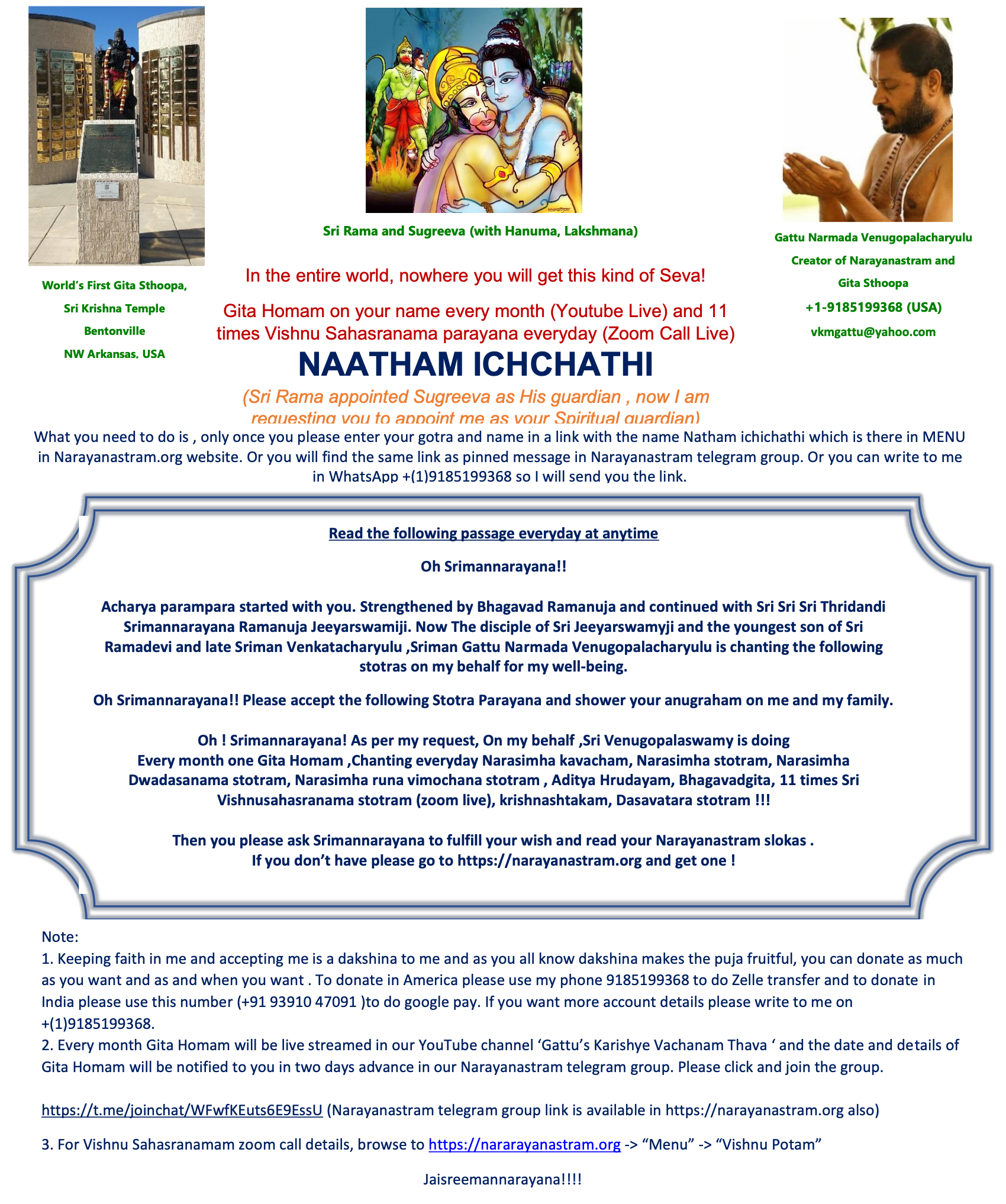 In order to recite Sri Vishnu Sahasranama Stotra in your name for 24 hours, 365 days and thereby permanently, to recite Srimad Bhagavad Gita every day in your name, give your gotra names here for the welfare of the world. Offer your heartfelt dakshina with respect to your original strength and recitations every month. Click here to know more details on Donations.